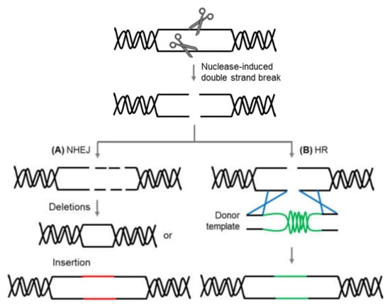 Genome editing is a collection of strategies and techniques developed to make a defined or tailored alterations in the genetic composition of an organism [3]. The key tool of this editing technology is the use of site-specific nuclease (SSN), a programmable nuclease that targets specific gene sequences in a precise manner. The use of these engineered nucleases to precisely delete, insert, and replace specific gene sequence highlights the edge of the site-directed mutagenesis approach and thus is favored over random mutagenesis techniques [4]. Genome editing technologies include customized homing nuclease (meganuclease), zinc-finger nucleases (ZFNs), transcription activator-like effector nucleases (TALENs), which all rely on protein-based systems with customizable DNA-binding specificities for targeting gene sequence, and the more recent platform clustered regularly interspaced short palindromic repeats-CRISPR associated 9 nuclease (CRISPR-Cas9), which depends on RNA as a targeting moiety that directs the nuclease to a defined DNA sequence [5,6]. These genome editing technologies work through employing site-directed nucleases to induce double-strand breaks (DSBs) at predefined genomic loci. The formation of DSBs stimulates the recruitment of endogenous host DNA repair factors that act in either of the two repair pathways: homologous recombination (HR) or non-homologous end-joining (NHEJ) [7,8] (Figure 1). HR repairs DSB through the integration of sequences that contain sequence homology flanking the DSB. HR-mediated repair thus can be used to insert desired sequences through recombination of exogenous repair or donor templates with the target locus [9]. DSB can be also repaired via the error-prone NHEJ machinery that introduces random insertion or deletion mutations (indels) in varying lengths, resulting in frameshift mutations in the coding sequence, thereby creating gene knockouts [1]. In contrast to the HR-mediated repair mechanism, the NHEJ repair pathway occurs with higher frequency in most organisms, including plants [10]. The ability of these genome editing technologies to induce DSB at specific genomic locus has made them a powerful tool for targeted genome modifications.