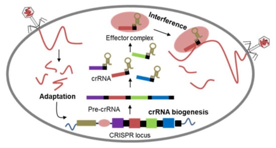 Bacteria are in a persistent battle with bacteria-specific viral predators—bacteriophages. To fend off bacteriophage infection, bacteria have evolved diverse immune mechanisms that act at different stages of the phage infection process [20]. These immune mechanisms described so far involve phage attachment aversion, DNA entry blockage, restriction-modification systems, abortive infection, assembly interference, and CRISPR-Cas system. Among these immune mechanisms, only the CRISPR-Cas system represents the known adaptive immune system in prokaryotes [20,21]. The mechanism of CRISPR-Cas immunity is divided into three distinct stages: integration of short sequences as “spacers” from invading foreign DNA, biogenesis of CRISPR RNA (crRNA), and interference of target DNA by crRNA [22]. In the first stage, the acquisition of a new spacer sequence happened through the processing of the identified foreign DNA and integration into the CRISPR locus. The CRISPR locus is then transcribed in the next stage to generate a single RNA, which is subsequently processed to form shorter mature crRNAs, each containing a single spacer sequence. During the final stage, an effector complex is formed comprising of a Cas nuclease and crRNA. The effector complex then destroys the foreign DNA that carries a sequence complementary to the crRNA [23] (Figure 2). The immunity conferred by the CRISPR-Cas system relies on the library of spacer sequences matching a phage genome or foreign DNA. The infection of a novel phage leads to the addition of new spacer sequences, resulting in the expansion of the CRISPR array [24]. CRISPR-Cas system keeps records of past infections as CRISPR array, allowing it to elicit rapid immune response upon reinfection process [23].