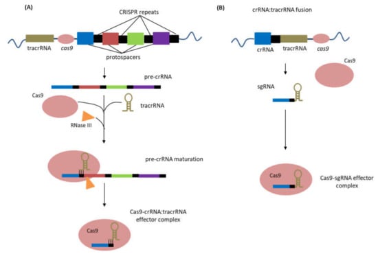 Considering the stages of CRISPR-Cas immunity, the type II CRISPR-Cas systems integrate short sequences from invading foreign DNA into the CRISPR array in the host genome [24]. Transcription of the CRISPR array results in the formation of a single pre-crRNA transcript that is subsequently processed to form mature short crRNAs that can pair with complementary sequences (protospacers) of the invading foreign DNA. This process of pre-crRNA maturation is directed by the hybridization of another RNA known as the trans-activating crRNA (tracrRNA) and facilitated by the activities of RNase III and Cas9 protein [34]. The crRNA and tracrRNA base-paired structure forms a complex with the Cas9 nuclease, activating Cas9 for site-targeted cleavage of DNA. Cleavage of the target DNA by Cas9 nuclease occurs at sites determined by the crRNA with a complementary sequence to the target protospacer DNA lying adjacent to a short sequence referred to as protospacer adjacent motifs (PAMs). The PAM is an essential recognition sequence that determines the target strand for cleavage. It also serves as a motif that delineates CRISPR loci from other genetic material, preventing the loci itself as the target. Different types of CRISPR-Cas systems require different PAM sequences [35,36]. In general, type II CRISPR-Cas systems require three components (crRNA, tracrRNA, and Cas9 nuclease) to target and induce cleavage of DNA (Figure 3A).