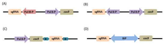 Figure 4. CRISPR-Cas9 expression cassette structures. (A) Mixed-dual promoter system. The typical expression cassette structure of CRISPR-Cas9, consisting of two different classes of promoters, Pol II and Pol III promoters controlling the expression of cas9 and sgRNA, respectively. (B) Dual Pol II system. The cas9 and sgRNAs are expressed in separate expression units under the control of two independent Pol II promoters. (C) Single transcriptional unit. Both the cas9 and sgRNA are expressed as a single transcript under the control of a single Pol II promoter. The RNA processing system (X: csy4, ribozyme, tRNA) is usually incorporated in the construct to separate sgRNA from cas9 after transcription. (D) Bidirectional promoter system. A bidirectional promoter (BiP) which can initiate transcription in both orientations is used to express both cas9 and sgRNA.