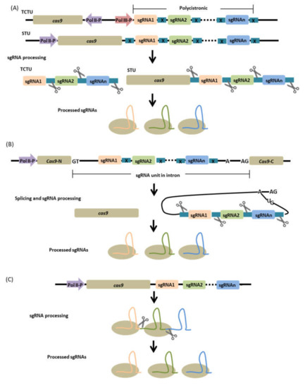 One important consideration in using Pol II promoters for sgRNA expression is the incorporation of appropriate sgRNA processing systems in the molecular construct. Generally, transcripts produced by Pol II promoters are modified by 5′ capping and 3′ poly-A tail addition and subsequently transported to the cytosol from the nucleus. These post-transcriptional modifications and altered localization could potentially affect the efficient use of sgRNAs. Hence, the incorporation of sgRNA processing systems would allow the excision and processing of sgRNAs from the Pol II transcripts into mature sgRNAs [115]. Details on these sgRNA processing systems are discussed in the succeeding texts, and the context of multiplexed genome editing.