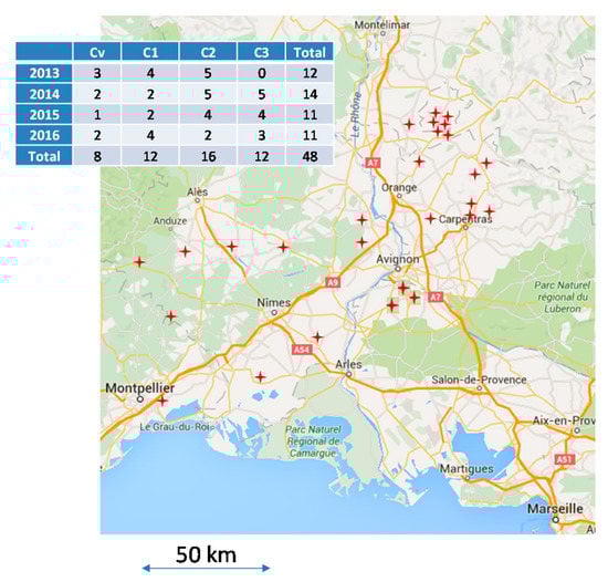 From 2013 to 2016, we analyzed the regional climatic conditions and natural pest and disease pressure in the grapevine growing area selected (Figure 1). The whole network area is characterized by a typical Mediterranean climate. The average annual climatic features, based on 1981–2010 data from Météo-France, the French national meteorological service, gathered at the “Carpentras-Serres” site, are the following: (i) minimum temperature, 8.1 °C; (ii) maximum temperature, 20.6 °C; (iii) rainfall, 648 mm; and (iv) number of rainy days, 65.7 days. Following the methodology proposed by Renaud-Gentie et al. [], we performed a hierarchical classification on these climate data. We used the monthly rainfall amounts and monthly average minimum and maximum temperatures from April to September for the years 1993 to 2017. Three major Mediterranean annual climatic types were identified. They were observed during the four years of this study, as shown in Table 2a.