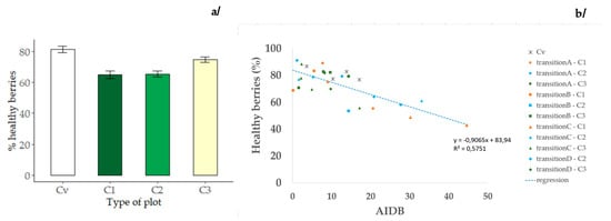 Percentage of healthy berries at harvest measured on conventional and in-conversion plots. (a) Dynamics of healthy berries percentage during conversion (error bars represent the standard errors); (b) Relationship among healthy berries percentages and AIDB (linear regression), the symbol shape indicates the intensity of the conversion process from A to D, the color shape indicates the stage of conversion (C1 to C3). We excluded two outliers from the analysis of this relationship which consisted of two plot * year situations with low percentages of healthy berries (21 and 37%) but null or quasi-null AIDB values. We identified them as 2015 occurrences of high severities of Black rot, not taken into account by AIDB.