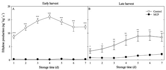Ethylene production of early (A) and late-harvested ‘Empire’ apples (B) and stored at 0.5 °C in air storage up to 7 months and evaluated for 7 d at 20 °C. Bars represent error of the means (SEM; n = 5), when larger than the dimension of the symbol. *, **, *** Adjacent to each data point for each storage time indicates significant differences as determined by Duncan’s multiple range test at p ≤ 0.05, 0.01 or 0.001, respectively. MCP-methylcyclopropene.