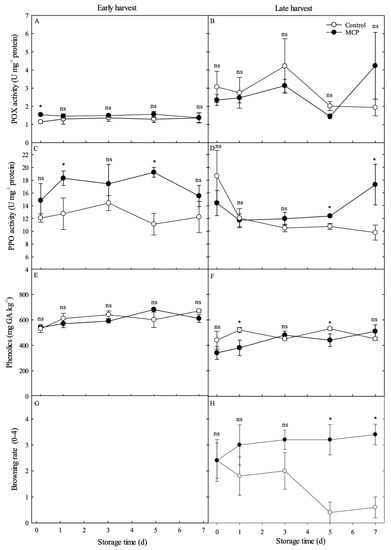 Peroxidase (POX) (A,B), PPO (C,D), total phenolic contents (E,F) and browning (G,H) of early and late-harvested ‘Empire’ apples and stored at 0.5 °C in air storage up to 7 months and evaluated for 7 days at 20 °C. Bars represent error of the means (SEM; n = 5), when larger than the dimension of the symbol. * Adjacent to each data point for each storage time indicates significant differences as determined by Duncan’s multiple range test at p ≤ 0.05; ns—not significantly different.