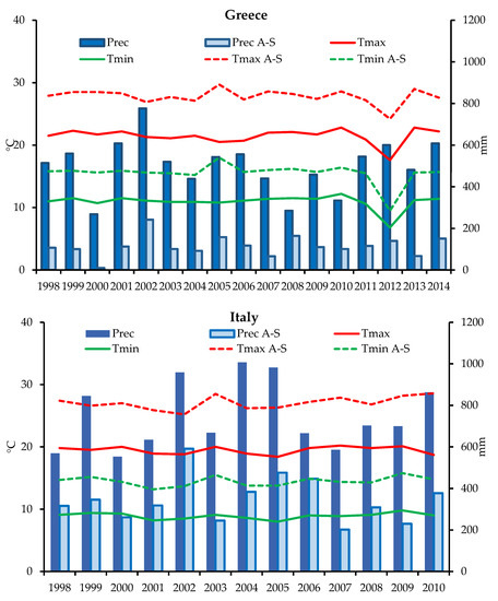 Meteorological parameters (1998–2014) in the switchgrass long-term screening trials in Greece at Aliartos (upper graph) and in Italy at Ozzano (below graph). Tmax = mean annual maximum temperature (°C); Tmin = mean annual minimum temperature (°C); Prec = annual cumulative precipitation (mm); Tmax A–S = mean maximum temperature from April to September (°C); Tmin A–S = mean minimum temperature from April to September (°C); Prec A–S = cumulative precipitation from April to September (mm).