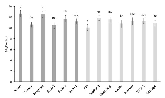 Above ground biomass yield (Mg DM ha−1) of the 13 switchgrass varieties (dark grey histograms = lowland; light grey histograms = upland) grown at Aliartos (Greece) during the 1998–2014 period (main effect: variety). Vertical bars: standard error. Different letters: statistically significantly different means for P ≤ 0.05 (LSD test).