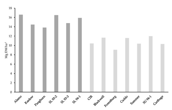 - Casler, M.D.; Vogel, K.P. Selection for biomass yield in Upland, Lowland, and hybrid switchgrass. Crop Sci. 2014, 54, 626–636. [Google Scholar] [CrossRef]