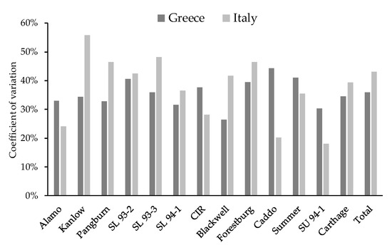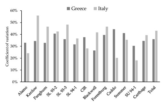 It is worth remembering that the data from Italy are just from one replicate, thus making the comparison among varieties not statistically possible. In Greece, the ceiling AGB was reached between the second and fourth years after establishment (1999–2001), with mean yields almost 60% higher than the mean of the rest of the study years (16.6 vs. 10.1 Mg DM ha−1 for the 1999–2001 vs. 2002–2014 period, respectively). In Italy, the switchgrass growth behavior was quite similar to that in Greece, but when comparing the coefficients of variation (CVs) among the tested varieties for the two locations (Figure 4), the variability was more pronounced for Italy, as expected due to the lack of proper replicates. The mean CVs for AGB were 36% and 43% in Greece and Italy, respectively.