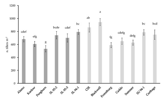 Mean tiller density (no. of tillers m−2) of the 13 switchgrass varieties (dark grey histograms = lowland; light grey histograms = upland) grown at Aliartos (Greece) during the 1998–2014 period (main factor: variety). Vertical bars: standard error. Different letters: statistically significantly different means for P ≤ 0.05 (LSD test).