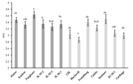 In Greece, the plant stem diameter varied significantly among the tested switchgrass varieties (Figure 7), with Pangburn having a mean value of 3.64 mm, significantly different from that of Blackwell (2.99 mm, P ≤ 0.05). The lowland ecotypes showed larger diameters compared to the upland ones (3.40 vs. 3.15 mm for lowland vs. upland, respectively; P ≤ 0.05).