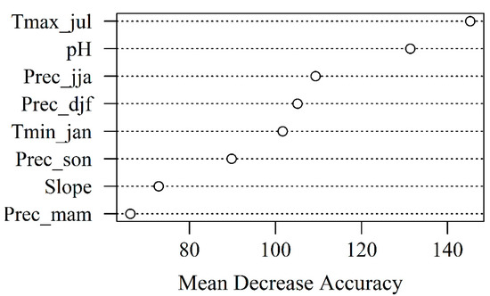 Relative importance of climatic variables, expressed as mean decrease accuracy, in the classification process as derived from random forest calibration. Variables are pH; slope; Tmax_jul: monthly average maximum temperature of July; Tmin_jan: monthly average minimum temperature of January; Prec_djf, Prec_mam, Prec_jja, and Prec_son cumulated precipitation of winter, spring, summer and autumn seasons, respectively.