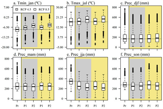 Trends in independent climatic variables (Tmin_jan = Tmin in January (a), Tmax_jul = Tmax in July (b), and the four seasonal cumulated precipitations, namely Prec_djf (c), Prec_mam (d), Prec_jja (e), Prec_son (f)) calculated over multiple years using the modelling ensemble (EN), for two climate scenarios (RCP 4.5 and 8.5) and time-slices (P1 = 2011–2040 and P2 = 2041–2070, respectively) compared to the present (PR = 1970–2000). Black lines show the median while the dotted line represents the median of the present along the scenarios. Boxes delimit the 25th and 75th percentiles. Whiskers are 10th and 90th percentiles.