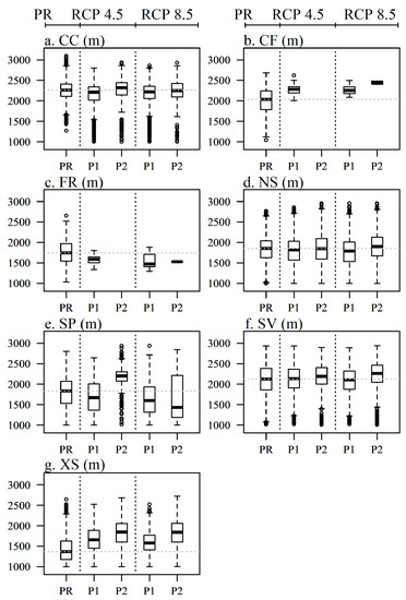 Changes in altitude as reported by the modeling ensemble for each of the seven single macro-types calculated over multiple years for two climate scenarios (RCP 4.5 and RCP 8.5) and time-slices (P1 = 2011–2040 and P2 = 2041–2070, respectively) compared to the present (PR = 1970–2000). Black lines show the median of the altitude calculated by the modeling ensemble, while the dotted line represents the median of the altitude for the present along the scenarios. Boxes delimit the 25th and 75th percentiles. Whiskers are 10th and 90th percentiles.