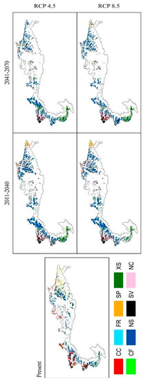 The seven macro-types showed different dynamics under future climate conditions, ranging from a large decrease for some, to slight increases for others (Table 4 and Figure 4 when analyzing the entire Alpine chain), depending on the region analyzed (Tables S3 and S4). Specifically, shrub species (SP) strongly decreased for 2041–2070, with the highest reduction under RCP4.5 (−79%) rather than RCP8.5 (−66%) across the entire Alpine chain, where the Western area accounted for the highest decreases (−94%) with respect to the Eastern (−64%) (Tables S4 and S3, respectively). Pastures dominated by Carex curvula (CC) reported a similar decrease for 2011–2040 and 2041–2070 time slices with losses ranging from −67% to −75% for RCP4.5 and −61% to −74% for RCP8.5 climate scenarios. The main reductions of CC occurred more in the Eastern Alps in the distant future (−82%) compared to the Western (−69%), while in the near future an opposite trend was projected between the two regions (−54% and −73% for the Eastern and Western Alps, respectively). Pastures dominated by Carex firma (CF) indicated very high decreases for 2011–2040 under RCP4.5 (−81%) and RCP8.5 (−76%), with a complete loss of suitable areas for 2041–2070 under both RCP climate scenarios (−99% and −100%, for 4.5 and 8.5, respectively). The main losses of CF resulted in the Eastern Alps (−79% and −100%) with respect to the Western area (−34% and −84%). Areas suited to pastures dominated by Nardus stricta (NS) slightly decreased in 2041–2070 under RCP4.5 (−21%) and RCP8.5 (−16%), while for 2011–2040 they showed almost no change (−1%) under RCP4.5 and a slight increase (+8%) under RCP8.5. These NS increases were in the Eastern Alps only (+14% in the near future). Pastures dominated by Festuca gr. rubra (FR) showed relevant decreases in the near future (2011–2040) in both RCP scenarios (−59% and −86% for RCP4.5 and 8.5, respectively), while a complete loss is projected in the distant future (2041–2070) for both RCP scenarios (−98% and −93% for RCP4.5 and RCP8.5, respectively). The lowest losses of FR in the near future (2011–2040) resulted across the Western Alps (−59%), while in the 2041–2070 time-slice both Eastern and Western Alpine regions had a complete loss of FR macro-type. Considering the entire Alpine chain, xeric species (XS) in 2011–2040 showd no change or a slight decrease (−4%) under RCP4.5 and RCP8.5, respectively. Conversely, in the distant future (2041–2070) areas suited to XS increased under both RCP4.5 (+13%,) and RCP8.5 (+7%). These contrasting results were derived from an opposite trend between the two Alpine regions. Specifically, the Western Alps had expansions of areas suited to XS in both the time slices considered (+78% and +85% in the near and distant future, respectively), whilst the Eastern area showed decreases ranging from −58% to −43% in 2011–2040 and 2041–2070, respectively. Finally, pastures dominated by Sesleria varia (SV) showed the lowest (−27%) and the highest (−57%) reductions under RCP4.5 for 2011–2040 and 2041–2070, respectively, while a reduction of around −44% was found for both time-slices under RCP8.5. In the distant future (2041–2070), the main reductions of SV suitability resulted across the Eastern Alps (−64%), while, in the near future (2011–2040), the two areas showed a similar pattern.