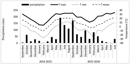 Monthly precipitation and average, maximum and minimum temperature during 2014–2016 growing seasons.