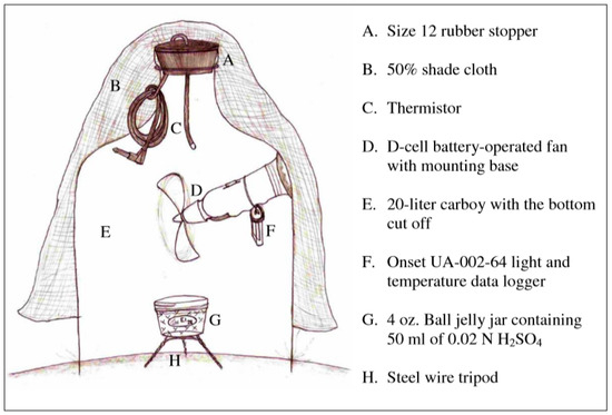 Manure was applied uniformly at the rate of 56,000 L ha−1 [22]. Immediately after surface application, a glass chamber with a sampling jar that contained 50 mL 0.02M H2SO4 was placed over the manured land. The ammonia volatility measuring chambers covered a 0.06 m2 surface area with one liter of manure in the center and were moved to a new location at the beginning of each hour of sampling, so that the manure being sampled was exposed to ambient conditions and not influenced by chamber conditions (Figure 2).