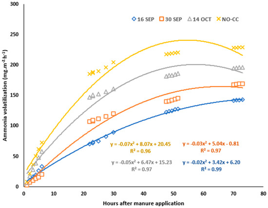 Figure 3 illustrates the pattern of NH3-N loss during 73 h after manure application. The highest rates of ammonia volatilization were detected in the first 24 h after spreading on all treatments. Manure applied to the soil with cover crop significantly emitted less NH3-N compared to no cover crop soil (Figure 3). Figure 3 also indicates that ammonia loss was smaller with mid-September planting date than delayed planting. These trends agree with the result from another experiment by [29,30] found that 57–77 percent of total NH3-N emission occurred in the first 24 h. Similarly, [31] concluded that 85 percent of NH3-N volatilization occurred within 24 h with surface applied manure. Ammonia volatilization could continue at significantly much lower rates past the 120–150 h sampling period.