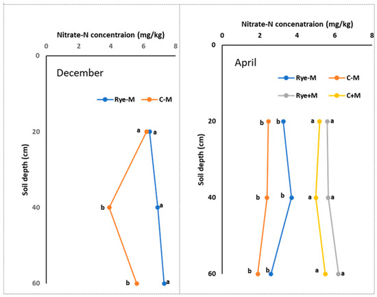 Nitrate-N levels in soil profile as affected by manure application and cover crop. Letters note separation of means by Duncan’s New Multiple Range Test, p = 0.05. Date of soil sampling (April) and (December). Rye cover crop added manure (Rye + M), Rye cover crop with no manure (Rye-M), No cover crop with added manure (C + M) and no cover crop with no manure (C − M).