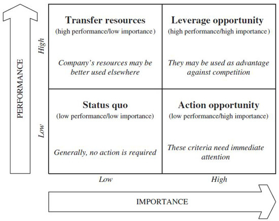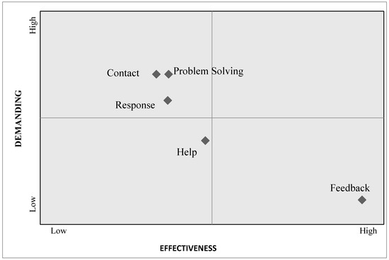The MUSA method offers a significant advantage over other methods, including that the results of this method can be used to improve continuously the quality of the system [11]. Other methods can only provide a quantified estimate of the total customer satisfaction and unsatisfactory information for in-depth analysis of customer satisfaction and specific satisfaction for each dimension specified. The MUSA method not only identifies, in addition to global and partial satisfaction for each dimension of satisfaction, but also, with the construction and improvement of action diagrams, indicates the points at which the business must be improved to increase customer satisfaction and gives the priority that should be given to actions for improvement. The action diagram, shown in Figure 1, is divided into quadrants according to performance and importance [33], and the improvement diagram, shown in Figure 2, is divided into quadrants according to demanding and effectiveness.