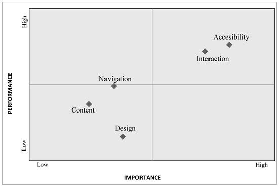The results of the MUSA method show that the criteria of Interaction and Accessibility seemed to be the most important for the users of the web portal [42] (Table 3). The most important criterion was accessibility which was weighted 28.98%, and the second most important criterion for website users was interaction, with a 26.20% weight. The remaining criteria presented similar importance for the users.