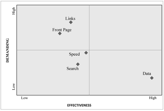 Regarding the action diagram for the Navigation criterion (Figure 5), we observed that the Search and Data sub-criteria are in the high performance and importance quadrant and constitute the comparative advantage of the website. On the other hand, the Front Page and Links sub-criteria are in the state of small effort/low effectiveness, which means that they should be closely monitored since they could become important to users in the future.