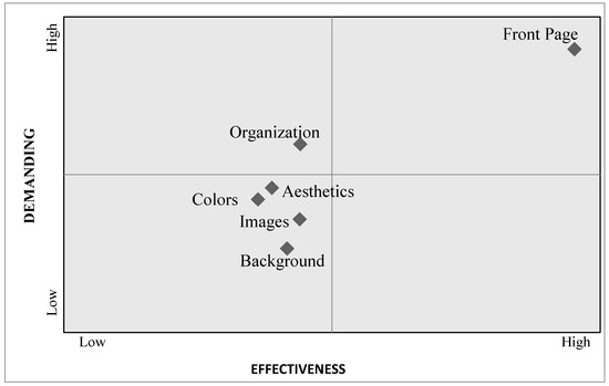 Regarding the improvement diagram of the Design criterion, a major priority is to improve the FrontPage D., while all other features, except from the Organization, are not of high priority for improvement (Figure 8).
