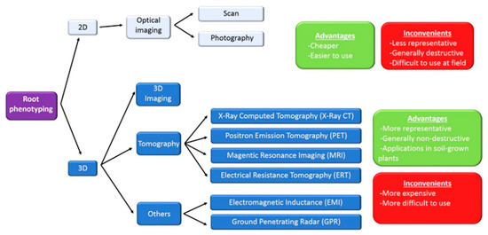 Technologies for root phenotyping. At the top of the figure, classical non-destructive 2D techniques, based on optical imaging, are indicated. Plant root systems are three-dimensional (3D) structures with many features, difficult to quantify in 2D. Advances for phenotyping root architecture in 3D imaging are nowadays available. Non-destructive 3D root phenotyping includes tomographic techniques [X-ray Computed Tomography (X-ray CT); Positron Emission Tomography (PET); Magnetic Resonance Imaging (MRI) and Electrical Resistance Tomography (ERT)]. More recently, two geophysical approaches, Electromagnetic Inductance (EMI) and Ground Penetrating Radar (GPR), have been developed. Advantages and inconvenients of the different technologies are indicated.
