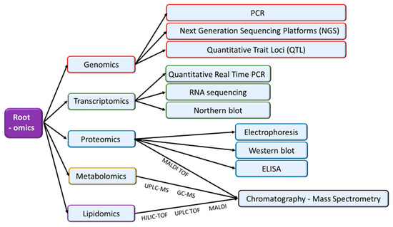 Moreover, studies regarding root cell membrane have reported differences in plasma membrane viscosity and fluidity, highly influenced by plasma membrane/tonoplast intrinsic proteins [60]. Staining and microscope evaluation is usually used for these studies [61], as well as the analyses of K+ and H+ fluxes with selective electrodes [62]. Under osmotic and salt stress conditions, root cells exhibit a decrease of plasma membrane fluidity and an increase of its microviscosity [61,63] although at long term, there is an increase of membrane permeability induced by its degradation [62]. The most relevant analytical techniques used in each -omic approach are indicated in Figure 2.