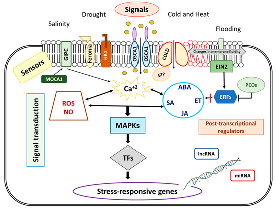 Stress perception is the first step for which external stimuli activate diverse receptors/sensors to trigger signal transduction cascades. Although the absence of clear ligands makes difficult to identify these sensors, they seem crucial for developing stress tolerance [64].