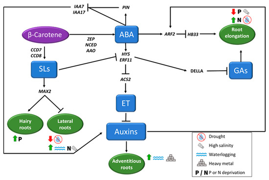 Root architecture (considering root elongation, and hairy, lateral, and adventitious roots formation) under abiotic stress conditions is regulated by phytohormones, that induce or repress the process depending on the adverse condition. Abscisic Acid (ABA) plays a key role in regulating root cell elongation in different ways, repressing Gibberellins (GAs) through an increase of DELLA proteins concentration or inhibiting auxins biosynthesis. Auxins and Strigolactones (SLs), also play important role in root architecture, inducing or repressing the formation of new roots depending on the adverse environmental situation, as indicated in the figure.