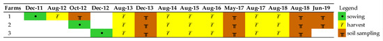 In the three farms, soils were sampled at 0–30-cm depths in different growing seasons (Figure 1). The samples were air-dried, powdered and sieved at 2 mm prior to being analyzed for the main physicochemical soil properties. Bulk density (BD; kg m−3) was estimated by using a pedotransfer function specific for Mediterranean regions from clay, sand and SOC content (% w/w), following Pellegrini et al. [47]: