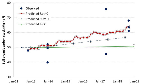 In S0, SOCS predicted by SOMBIT and RothC decreased, on average, by 267 ± 14 and 61 ± 0.3 kg C ha−1 per year. These findings are consistent with a decrease observed by Mazzoncini et al. [94] in a 28-years trial in similar conditions. Contrariwise, in S1, SOCS predicted by SOMBIT and RothC increased in average by 905 ± 110 and 1009 ± 53 kg C ha−1 per year, respectively. The higher increase occurred in the last year of CAR cultivation for both models when, at explant, all roots were left in the soil.