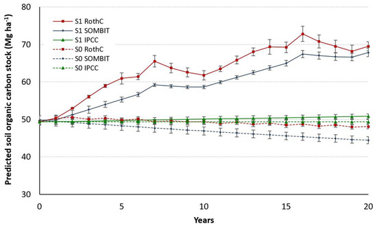 Figure 3 shows the SOCS predictions by the three models over 20 years of simulation, for both S0 and S1. In all predictions, the SOCS changes under S0 showed a maintenance (IPCC tool) or slow decrease (SOMBIT and RothC), while in S1, a slight (IPCC tool) or a noteworthy increase (SOMBIT and RothC) in the SOCS values were observed.