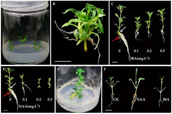Tissue culture process of Pseudostellaria heterophylla (A) Axillary buds induced after one week; (B) Four-week-old micro-shoots developed in medium supplemented with 1.5 mg·L−1 of 6-benzyladenin (BA); (C,D) In vitro rooting on Murashige and Skoog (MS) medium with different concentrations of indole-3-butyric acid (IBA) and naphthaleneacetic acid (NAA) (white arrows indicated the site of adventitious roots growth, and red arrows indicated the roots formed at the base of the stem); (E) Spindle-shaped root appeared after three months of culturing; (F) Ex vitro rooting in treatments with 100 mg·L−1 of NAA and IBA (scale = 1 cm).