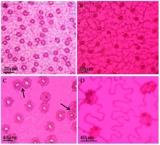 Foliar epidermal peels of abaxial surfaces of P. heterophylla (A) Leaf stomata of In vitro-raised plants; (B) Leaf stomata of ex vitro-raised plants after four weeks of culture; (C,D) Magnified view of stomata from in vitro and ex vitro plantlets, respectively (arrows indicate contiguous stomata).