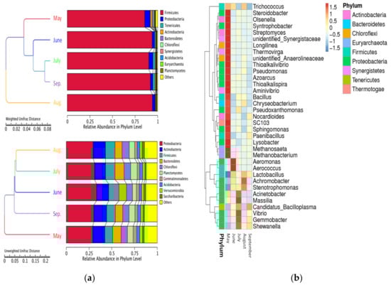 (a) Unweighted pair–group method with arithmetic means cluster tree based on unweighted and weighted unifrac distance. This was displayed with the integration of clustering results and the relative abundance of each sample by phylum. (b) The top 10 taxa at the genus level were selected to form the distribution histogram of relative abundance.