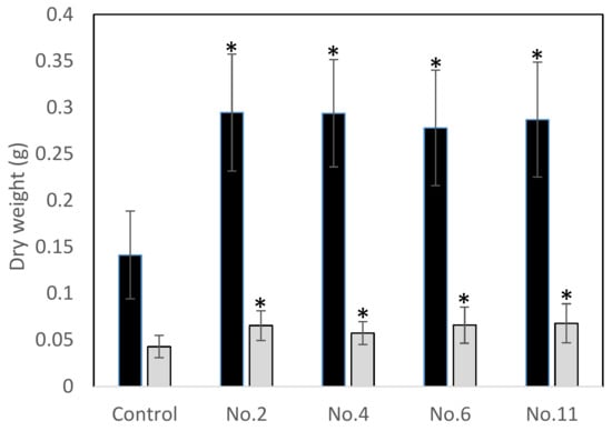 Growth response of Brassica campestris with plant growth-promoting bacteria selected in this study. Control (n = 7), strain number 2 (n = 10), strain number 4 (n = 10), strain number 6 (n = 7), strain number 11 (n = 10), Dunnett test (p < 0.05). The vertical bar indicates the standard error. * indicates significance differences between treatments when compared with the control (p < 0.05).