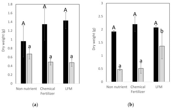 Pot experiment testing lettuce (a) and Brassica rapa (b) growth using liquid food waste materials (LFM). Values presented are means and standard error (n = 3). Closed bar and Gray bar mean edible part and root, respectively. Treatments of the same crop with different letters are significantly different by Tukey’s HSD (p < 0.05).
