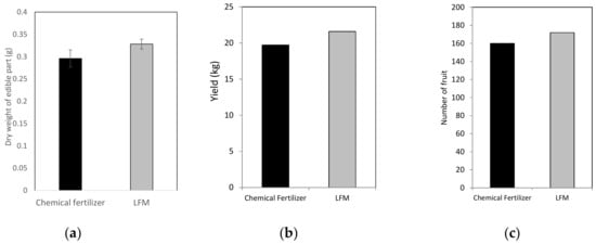Field experiments were conducted to assess the effect of LFM on the growth of Brassica rapa, lettuce and eggplant. The growth of Brassica rapa and lettuce in the field was similar to that in the pot experiment. The heights achieved by Brassica rapa were 33.0 ± 0.67 cm and 32.5 ± 0.78 cm, with LFM and chemical fertilizer, respectively. The lettuce grown with LFM amendment was slightly larger than that grown with chemical fertilizer, but not significantly so (Figure 4a). Eggplant also grew slightly better with LFM than with chemical fertilizer, but the differences were not significant (Figure 4b,c for eggplant).