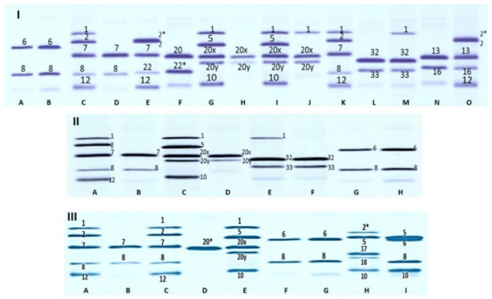 HMW-GS composition observed in a durum wheat collection. I, Moroccan landraces. Lanes are as follow: A, ‘Langdon’ (Glu-B1 6+8); B, MGB-9327 (Glu-B1 6+8); C and K, ‘Pitic’ (Glu-A1 1, Glu-B1 7+8, Glu-D1 2+12); D, MGB-9404 (Glu-B1 7+8); E, ‘Wilbur’ (Glu-A1 2*, Glu-B1 7+22, Glu-D1 2+12); F, MGB-2963 (Glu-B1 20+22*); G and I, ‘Shan 229′ (Glu-A1 1, Glu-B1 20x+20y, Glu-D1 5+10); H, MGB-3082 (Glu-B1 20x+20y); J, MGB-16563 (Glu-A1 1, Glu-B1 20x+20y); L, MGB-3003 (Glu-B1 32+33); M, CI-12213 (Glu-A1 1, Glu-B1 32+33); N, MGB-5963 (Glu-B1 13+16); O, ‘Opata’ (Glu-A1 2*, Glu-B1 13+16, Glu-D1 2+12). II, Moroccan cultivars. Lanes are as follow: A, ‘Pitic’ (Glu-A1 1, Glu-B1 7+8, Glu-D1 2+12); B, MGB-20 (Glu-B1 7+8); C, “Shan 229” (Glu-A1 1, Glu-B1 20x+20y, Glu-D1 5+10); D, MGB-32 (Glu-B1 20x+20y); E, CI-12213 (Glu-A1 1, Glu-B1 32+33); F, MGB-33 (Glu-B1 32+33); G, ‘Langdon’ (Glu-B1 6+8); H, MGB-34 (Glu-B1 6+8). III, North American cultivars. Lanes are as follow: A and C, ’Pitic’ (Glu-A1 1, Glu-B1 7+8, Glu-D1 2+12); B, MGB-66092 (Glu-B1 7+8); D, MGB-66023 (Glu-B1 20*); E, ‘Shan 229′ (Glu-A1 1, Glu-B1 20x+20y, Glu-D1 5+10); F, ‘Langdon’ (Glu-B1 6+8); G, MGB-66049 (Glu-B1 6+8); H, Pavon (Glu-A1 2*, Glu-B1 17+18, Glu-D1 5+10); I, MGB-66079 (Glu-B1 6+8, Glu-D1 5+10).