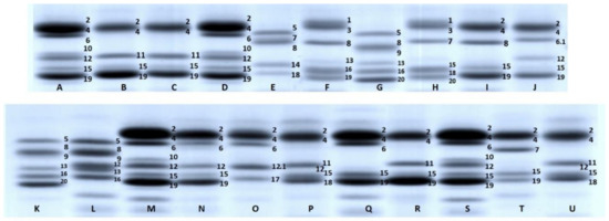 LMW-GS composition observed in a durum wheat collection of Moroccan landraces. Lanes are as follow: A, D, M and S, ‘Cocorit’ (Glu-A3 6+10, Glu-B3 2+4+15+19, Glu-B2 12); B, MGB-3091 (Glu-A3 11, Glu-B3 2+4+15+19, Glu-B2 null); C, MGB-5967 (Glu-A3 11, Glu-B3 2+4+15+19, Glu-B2 null); E, ‘Andalusia’ (Glu-A3 5, Glu-B3 7+8+14+18, Glu-B2 null); F, MGB-3152 (Glu-A3 null, Glu-B3 1+3+8+13+16+19, Glu-B2 null); G and K, ‘Fanfarron’ (Glu-A3 5+20, Glu-B3 8+9+13+16, Glu-B2 null); H, MGB-16563 (Glu-A3 20, Glu-B3 1+3+7+15+18, Glu-B2 null); I, MGB-2963 (Glu-A3 null, Glu-B3 2+4+8+15+19, Glu-B2 null); J, ‘BC’ (Glu-A3 6.1, Glu-B3 2+4+15+19, Glu-B2 12); L, MGB-3104 (Glu-A3 5, Glu-B3 8+9+13+16, Glu-B2 12); N, MGB-3083 (Glu-A3 6, Glu-B3 2+4+15+19, Glu-B2 12); O, MGB-3125 (Glu-A3 6, Glu-B3 2+4+17, Glu-B2 12.1); P and U, ‘Ardente’ (Glu-A3 11, Glu-B3 2+4+15+18, Glu-B2 12); Q, MGB-9430 (Glu-A3 6, Glu-B3 2+4+15+19, Glu-B2 null); R, MGB-3003 (Glu-A3 11, Glu-B3 2+4+15+19, Glu-B2 null); T, MGB-5963 (Glu-A3 null, Glu-B3 2+4+7+15+19, Glu-B2 null).