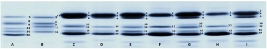 LMW-GS composition observed in a durum wheat set of Moroccan cultivars. Lanes are as follow: A, ‘Fanfarron’ (Glu-A3 5+20, Glu-B3 8+9+13+16, Glu-B2 null); B, MGB-20 (Glu-A3 5**, Glu-B3 8+9+16, Glu-B2 12); C, G and I, ‘Cocorit’ (Glu-A3 6+10, Glu-B3 2+4+15+19, Glu-B2 12); D, MGB-32 (Glu-A3 6, Glu-B3 2+4+15+19, Glu-B2 12); E, MGB-27 (Glu-A3 6+10, Glu-B3 2+4+15+19, Glu-B2 12); F, MGB-29 (Glu-A3 11, Glu-B3 2+4+15+19, Glu-B2 null); H, MGB-33 (Glu-A3 11, Glu-B3 2+4+15+19, Glu-B2 null).