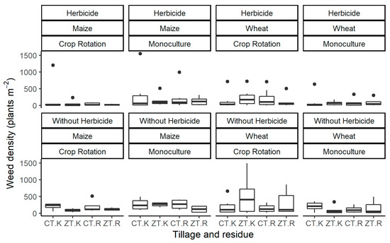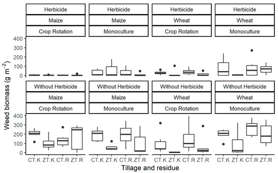 In maize subplots without herbicide application (Figure 1), a significant interaction was observed among all factors (tillage, rotation and residue), making interpretation of the overall effects complicated. Treatments with CT resulted in higher weed biomass than ZT treatments (220 ± 27 compared to 178 ± 43 g m−2), with treatments with rotation having lower weed biomass on average than monocultures (176 ± 29 compared to 222 ± 41 g m−2), but no apparent difference was observed due to residue retention (200 ± 35 and 198 ± 37 g m−2 with K and R, respectively). Effects of the treatments varied over the years; in 2005, the effects of all factors were significant, but this was not the case for 2013 and 2015 (Figure S1).