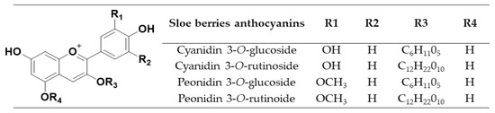The anthocyanins present in the sloe samples were identified by ultra-performance liquid chromatography coupled to a quadrupole-time-of-flight mass spectrometer, (UHPLC–QToF–MS) (Xevo G2, Waters Corp., Milford, MA, USA). The analytical column used was a reverse-phase C18 (Acquity UPLC BEH C18, Waters) with dimensions of 100 × 2.1 mm and a particle size of 1.7 μm. Two mobile phases were used—2% formic acid–water solution as phase A and methanol solution as phase B. The UAE extracts were filtered through a 0.22 µm nylon syringe filter (Membrane Solutions, Dallas, TX, USA). The flow rate was 0.4 mL/min and the volume injected was 3 µL. The total programmed gradient was as follows (time, % solvent B)—0.00 min, 15%; 3.30 min, 20%; 3.86 min, 30%; 5.05 min, 40%; 5.35 min, 55%; 5.64 min, 60%; 5.95 min, 95%; 7.50 min, 95%. The total run time was 12 min, including 4 min for re-equilibration. Mass spectra were acquired in positive ion mode under the following conditions: desolvation gas flow = 700 L h–1, desolvation temperature = 500 °C, cone gas flow =10 L h–1, source temperature = 150 °C, capillary voltage = 700 V, cone voltage = 30 V, and collision energy = 20 eV. “Full Scan” mode was used (m/z = 100–1200). The individual anthocyanins were identified based on their retention time and molecular weight. Four anthocyanins were identified in the samples with the following m/z ratios: cyanidin 3-O-glucoside, 449; cyanidin 3-O-rutinoside, 595; peonidin 3-O-glucoside, 463; peonidin 3-O-rutinoside, 609. The structures of the main anthocyanins present in sloes are shown in Figure 1.