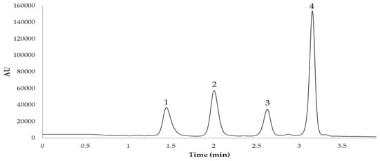 To separate and quantify the anthocyanins present in the sloe samples, an Elite UHPLC LaChrom System (Hitachi, Tokyo, Japan) was used. The equipment consists of an L-2200U autosampler, an L2300 column oven set at 50 °C, two L-2160U pumps, and a UV–Vis detector L-2420U. The analytical column used was a reversed-phase C18 (PhenomenexKinetex, CoreShell Technology, Torrance, CA, USA) of 2.1 × 50 mm and a particle size of 2.6 µm. Two mobile phases were used at a flow rate of 0.7 mL/min. Phase A was 5% formic acid–water solution and phase B was a methanol solution. Both solvents were filtered using a 0.22 µm filter (RephiLe Bioscience, Ltd., Shanghai, China) and degassed in an ultrasonic bath (Elma S300, Elmasonic, Singen, Germany). Before their identification, the UAE extracts were also filtered through a 0.22 µm nylon syringe filter (Membrane Solutions, Dallas, TX, USA). The injection volume was set at 15 μL and the absorption wavelength 520 nm. The gradient for the UHPLC separation was as follows (time, % solvent B)—0.00 min, 2%; 1.50 min, 2%; 3.30 min, 15%; 4.80 min, 15%; 5.40 min, 35%; 6 min, 100%. This gradient provided optimal results and easily integrable signals. Specifically, this method achieves a separation of the four major anthocyanins present in sloes in less than 4 min. The quantification of individual anthocyanins was carried out by means of a calibration curve, where cyanidin chloride was used as the reference standard. The regression equation (y = 300568.88x − 28462.43) and the correlation coefficient (R2 = 0.9999) were calculated. In addition, the limits of detection (LOD) (0.198 mg L–1) and quantification (LOQ) (0.662 mg L–1) were obtained as three and ten times, respectively, the standard deviation from the blank signal values divided by the slope of the calibration curve. Assuming that the different anthocyanins have similar absorbances, and taking into account their individual molecular weights, a calibration curve was prepared to quantify each anthocyanin. All the analyses were carried out in duplicate. The typical chromatogram obtained is shown in Figure 2.
