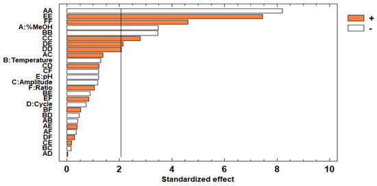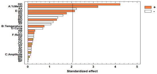 With respect to the p-values, these inform what factors and/or interactions have a significant influence on the response (YTP). Specifically, the factors and/or interactions with p-values below 0.05 were considered significant at a 95% confidence level. The same results can be graphically represented in a standardized Pareto chart (Figure 3).