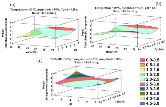 Three-dimensional surface plots representing the recovery of phenolic compounds according to a Box–Behnken design and depending on the following influential variables on the total phenolic compounds: (a) % methanol in water and pH; (b) % methanol in water and cycle; (c) pH and cycle.