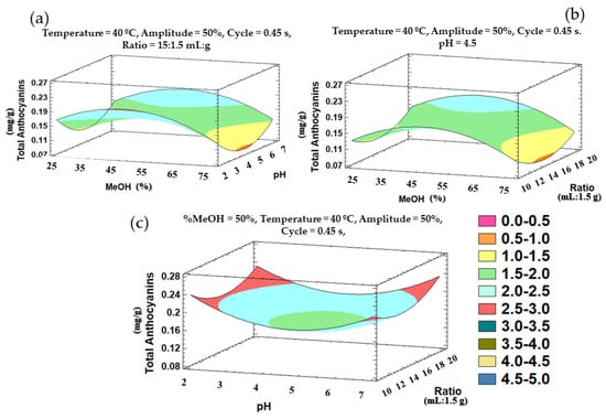 Three-dimensional surface plots representing the recovery of total anthocyanins according to a Box–Behnken design and depending on the following influential variables on the total anthocyanins: (a) % methanol in water and pH; (b) % methanol in water and ratio; (c) pH and ratio.