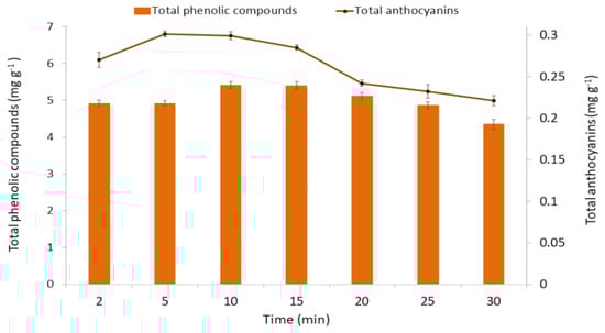 The phenolic compounds reached their maximum recoveries at 10 and 15 min. Naturally, a shorter time is more desirable for the corresponding savings. The maximum recovery of anthocyanins was reached at 5 min. In both cases, longer extraction times led to lower recoveries, probably due to the degradation of the bioactive compounds of interest [17].